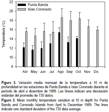La figura 3 presenta el comportamiento de la temperatura media mensual de abril a septiembre de 1989 en PBA y de abril a diciembre de 1989 en ICO. En general, la temperatura de ambos sitios de muestreo mostró una variación estacional con aguas más calidas durante los meses de verano y aguas más frías en los meses de otoño y primavera. También se observó que la temperatura media mensual en PBA fue aproximadamente 4°C menor que la registrada en ICO, indicando que durante este estudio prevalecieron las condiciones de surgencia en PBA. Así, las temperaturas medias durante el periodo de estudio para PBA fueron de 13.00 ± 1.83°C y de 16.33 ± 2.15°C en ICO. En la localidad de PBA las temperaturas medias más bajas se registraron en abril (12.15°C), mayo (11.65°C) y junio (11.94°C), mientras que en ICO fueron en abril (15.54°C), mayo (14.63°C), junio (15.61°C) y julio (15.41°C).