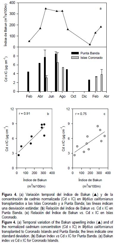 En la tabla 2 se presentan los promedios y errores estándar de las concentraciones de Cd en M. californianus transplantados al área de estudio. En general, durante todo el estudio las concentraciones medias de Cd fueron mayores en los mejillones de PBA (17.23 ± 1.89 [ig g-1 ps) que en los de ICO (9.86 ± 1.37 µg g-1 ps). La concentración de Cd previa al transplante fue de 8.3 ng g-1 ps. La variación temporal de la concentración de Cd normalizada (Cd x IC) mostró en general un comportamiento similar en ambas localidades. Los valores más bajos se presentaron a principios de primavera y durante el periodo otoño/invierno, mientras que los valores más altos fueron registrados durante los meses de abril a julio (fig. 4a). Valores altos del índice de Bakun correspondieron con valores altos de Cd x IC y viceversa. En ambas localidades de muestreo la concentración de Cd normalizada se correlacionó positivamente con el índice de Bakun (fig. 4b, c). Los valores de los coeficientes de correlación fueron de 0.91 en PBA y 0.75 en ICO.