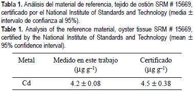 El análisis del Cd se realizó con un espectrofotómetro de absorción atómica Thermo Jarrel Ash 12 y la determinación se realizó a la flama de aire-acetileno. Las concentraciones de metal se reportan en microgramos por gramo de peso seco (µgg-1 ps). Se evaluó la calidad analítica del método procesando un blanco y una muestra de tejido de ostión (SRM# 15669) del National Institute of Standards and Technology por cada grupo de 15 submuestras (tabla 1).