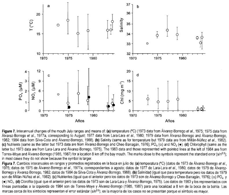 Data from San Quintín Bay are very scarce. However, evidence suggests some hypothesis about interannual and interdecadal changes, and about the influence of phenomena at a mesoscale (hundreds of kilometers) and large scale (103 km). During summer, oceanic phenomena are detected at the mouth with minimum temperature and salinity values (fig. 7a, b). The most interesting data are the minimum and maximum values. Comparing the June/July data from 1973 through 1984 for the mouth and for oceanic waters near the mouth (8 km) (fig. 7), it can be seen that the minimum temperature and salinity values were very different, for example, between 1979, a non-El Niño year, and 1984, an El Niño year (fig. 7a, b).
