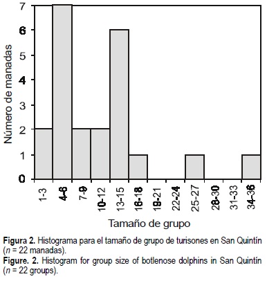 En lo que respecta a la distribución bimodal del tamaño de grupo, Caldwell (1992) propuso que la formación de grupos pequeños en San Quintín se debe a la baja profundidad de la zona, lo que se refleja en la alta frecuencia de grupos de 4-6 animales. Por otra parte, la formación de grupos de 13-15 animales puede explicarse si se considera que generalmente los grupos se agregan en zonas de alimentación (Hanson y Defran, 1993) formando manadas de mayor tamaño (Rossbach y Herzing, 1999); esto fue observado particularmente en las zonas A y C. Cabe destacar que tanto el promedio del tamaño de grupo reportado por Caldwell (1992) como el de este trabajo se encuentran sesgados por valores extremos derivados de una distribución bimodal. Por lo tanto, el promedio del tamaño de grupo reportado hace 10 años (