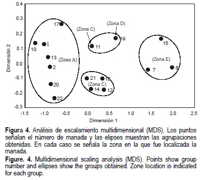 Para determinar la distribución espacial de los tursiones se graficaron las posiciones geográficas de las manadas sobre la zona de estudio (a priori). Las agrupaciones de avistamientos se compararon (a posteriori) mediante un análisis de escalamiento multidimensional (MDS por sus siglas en inglés, Kruskal y Wish, 1978). La distancia (kilómetros) entre avistamientos fue utilizada como índice de similitud para la prueba de MDS, y se usaron dos dimensiones según el modelo de Catell (Kruskal y Wish, 1978).