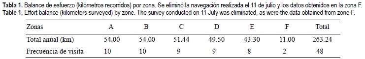 Como medida de esfuerzo se utilizó la distancia recorrida (kilómetros) durante la búsqueda de delfines (Reilly y Fiedler, 1994). Se realizó un balance de esfuerzo para reducir los sesgos ocasionados por sobremuestreos y navegaciones incompletas; se eliminaron los datos de una navegación cuando durante el mismo mes de muestreo se duplicó el esfuerzo sobre una misma zona, siempre y cuando la zona remuestreada fuera mayor a 1.5 km de longitud. También se eliminaron los datos cuando la zona no fue visitada al menos en el 85% de las navegaciones.