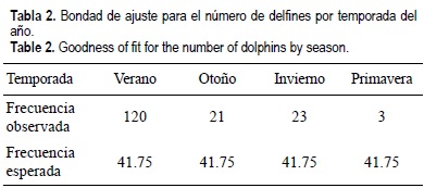 A lo largo de un año, el número de animales presentes por temporada (n = 167 después del balance de esfuerzo) mostró un aumento significativo durante el verano (χ2 = 201, P < 0.05, g.l. = 3, n = 167 delfines; tabla 2).