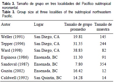 > = 11, DE = 8, n = 22 manadas) resultó menor al reportado para las costas de San Diego (Weller, 1991; Tepper, 1996; Ward, 1998) y similar a lo encontrado en las costas de Ensenada y San Quintín (Espinosa, 1986; Sandoval, 1987; Caldwell, 1992; Guzón, 2002; tabla 3). Se ha observado que en sistemas semi-cerrados (bahías, lagunas y canales costeros), el tamaño de grupo generalmente es menor a seis delfines (Irvine et al., 1981; Scott et al., 1990; Weller, 1998); por el contrario, en sistemas abiertos (como la costa al sur de San Quintín) este valor generalmente supera los 15 animales (Würsig, 1978; Ross et al., 1989).