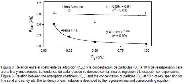La cantidad de sedimento resuspendido (Cp) es una variable importante asociada con el proceso de adsorción-desadsorción, ya que Cp es un indicador de la concentración de los sitios superficiales activos disponibles para la adsorción. Se ha observado que la capacidad de amortiguamiento de las partículas decrece al aumentar Cp, lo cual ha sido denominado "efecto de concentración de las partículas" (Di Toro et al., 1986; Honeyman et al., 1988; Herut et al., 1999). Dicho efecto se puede deber a: (1) que el equilibrio entre las fases disuelta y particulada no se ha alcanzado, (2) la competencia entre las partículas para ocupar sus sitios activos con el PID, ó (3) la presencia de coloides en la fase determinada como disuelta (Stumm, 1992).