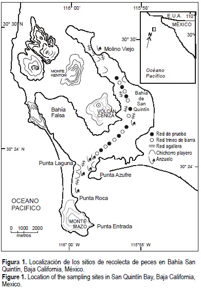 Se efectuaron recolectas mensuales de peces en la bahía durante 1994 para un total de 264 muestras; se emplearon cinco artes: red trineo, red de prueba, chinchorro playero, red agallera y anzuelo. En la figura 1 se presenta la localización de las estaciones. Al inicio de las recolectas en el brazo Bahía San Quintín se registró la temperatura (°C) superficial y a 5 m de profundidad (07:00-13:00), mediante un termómetro reversible y se presenta el promedio de cuatro repeticiones.