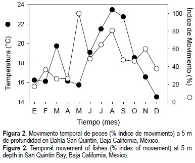 En San Quintín, cuando la temperatura disminuyó en la bahía durante mayo, el IM de peces aumentó en la profundidad de 5 m. El IM mostró que en Bahía San Quintín al disminuir bruscamente la temperatura, posiblemente los peces podrían responder moviéndose de profundidades mayores a someras, al igual que lo hacen en el Estero de Punta Banda y la Bahía de Todos Santos (Rosales-Casián, 1997a). Esta posibilidad merece ser investigada a futuro.