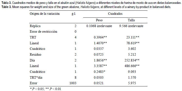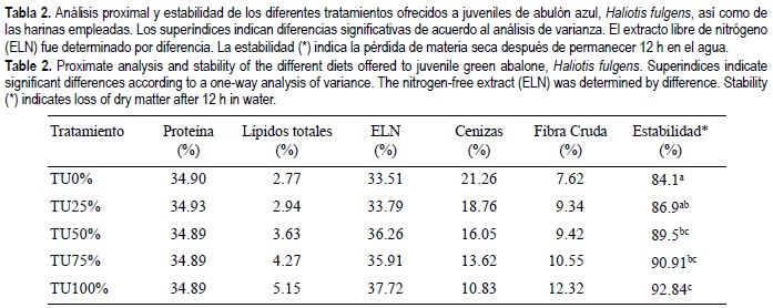 En pruebas preliminares en nuestro laboratorio (datos no publicados) se observó la capacidad de los abulones para ingerir un alimento balanceado con mosto de uva a un 15%, incluso presentando una coloración diferente después de dos meses de ingestión, lo que motivó el presente estudio. Sin embargo, en el presente trabajo se demostró que la inclusión gradual de mosto de uva resulta en un efecto negativo sobre el crecimiento. Estos resultados, comparados con la experiencia previa, son difíciles de interpretar, aunque quizá se deban a variaciones en el contenido mismo de taninos de los diferentes tipos de uvas (Belitz y Grosh, 1987), ya sea por variedad o madurez del fruto. Los taninos son compuestos fenólicos de sabor amargo cuya concentración en el alimento es inversamente proporcional al cosumo debido a la naturaleza astringente de los mismos, mientras que la disminución en la digestibilidad está influenciada por la capacidad que tienen los taninos para reaccionar con la proteína impidiendo su aprovechamiento (Badui, 1986; Church, 1988), esto debido a que la digestibilidad se ve disminuida por la inactivación de enzimas digestivas. La harina de mosto de uva contiene una cierta cantidad de taninos que, aunque no se cuantificaron en el presente trabajo ni en la experiencia previa al mismo, se sabe de su presencia (Belitz y Gosch, 1986). Las dietas aquí elaboradas contenían un 33% de harina vegetal, ya sea de M. pyrifera o de mosto uva, en vez del 16% recomendado por Guzmán y Viana (1998), de tal manera que el tratamiento con el 50% de harina de mosto de uva (TU50% en la tabla 4) correspondería a una substitución del 100% en la formulación recomendada. Dicho porcentaje de inclusión fue incrementado con el fin de incrementar la sensibilidad de la respuesta en el experimento. Los resultados de tasa de crecimiento aquí presentados son menores a los que se reportan como óptimos (alrededor de 80 día-1), que se consideran ideales para que una producción comercial sea rentable (Hahn, 1989), sin embargo, en otros trabajos se ha demostrado que el uso de M. pyrifera fresca, o bien seca, integrada a manera de alimento aglutinado con alginato de sodio, resulta en un crecimiento menor al obtenido con un alimento balanceado bajo condiciones experimentales (Viana et al., 1993, 1996).