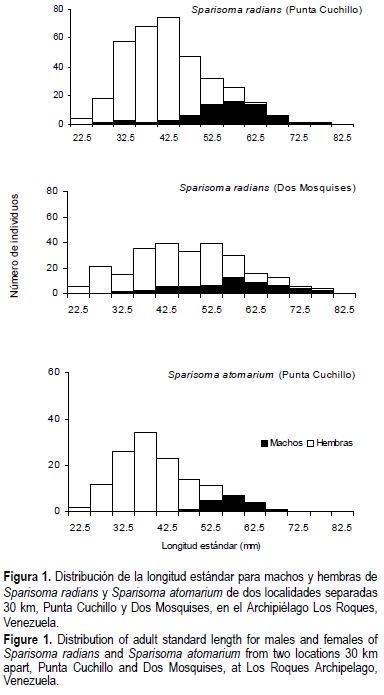 Los diferencias observadas entre S. radians y S. atomarium son consistentes con las reportadas por Robertson y Warner (1978) en Panamá: (1) una mayor sobreposición de tamaños entre los sexos en S. radians, con una frecuencia alta de machos pequeños y hembras grandes, cuando se compara con S. atomarium; (2) una razón global de sexos más sesgada hacia las hembras en S. atomarium que en S. radians. Para S. atomarium reportan una proporción de hembras similar en magnitud a la obtenida en este trabajo: 0.85 en una muestra de 355 individuos, la mayor de todas las proporciones que registran para ocho especies del género. Sin embargo, para S. radians reportan la menor proporción de hembras: 0.51 para 295 individuos, valor mucho menor inclusive que los obtenidos en las muestras de Punta Cuchillo y Dos Mosquises.