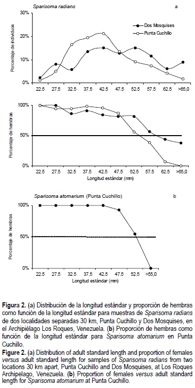 2. La clase de tamaños para el cambio de sexo en las muestras de S. radians es amplia. En Punta Cuchillo abarca desde los 50.0 mm hasta los 60.0 mm; por encima de este intervalo la razón de sexos está sesgada hacia los machos. En la muestra de Dos Mosquises la clase de tamaños crítica empieza en 55.0 mm y se extiende hasta las categorías más grandes. La curva de la proporción de hembras específica por tamaño se mueve en forma concomitante con la distribución del tamaño adulto, causando a su vez un desplazamiento en el mismo sentido de la clase de tamaños crítica (fig. 2a). Sparisoma atomarium presenta un cambio más marcado en la proporción de hembras específica por tamaño, con una clase de tamaños para el cambio de sexo estrecha (50.0-55.0 mm) (fig. 2b).