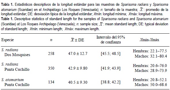 Cada individuo recolectado fue medido y pesado. La longitud total y estándar, y la altura, fueron registradas, así como el sexo y la fase gonadal. Se reportan aquí solamente el sexo y la longitud estándar de los individuos adultos. Las dos especies fueron cuidadosamente identificadas y discriminadas según las características de diagnóstico señaladas por Robertson y Warner (1978). La determinación de la madurez sexual se efectuó mediante examen macroscópico de las gónadas, siguiendo los criterios de Maeir (1929, citado por Holden y Raitt, 1975).