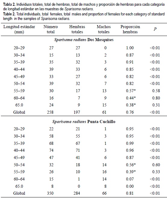La muestra de S. radians en Punta Cuchillo presenta una distribución de tamaños con una frecuencia alta de individuos entre 30.0 y 50.0 mm. La distribución en Dos Mosquises es relativamente más equitativa, con una alta frecuencia de individuos con tamaños superiores a los 50.0 mm (fig. 1). Esta diferencia se refleja en una media y dispersión de la longitud estándar más pequeñas en Punta Cuchillo con respecto a Dos Mosquises (tabla 1). La diferencia en los promedios de longitud estándar es estadísticamente significativa (prueba t robusta: T = 4.57; gl = ∞ ; P << 0.01.). La prueba de Kolmogorov-Smirnov para dos muestras, aplicada con las clases de tamaño expuestas en la tabla 2, detecta una diferencia máxima entre las dos distribuciones de frecuencia acumulada en la clase de 45.0-50.0 mm, la cual es estadísticamente significativa (Dmáxima = 0.1911; P < 0.01). Se infiere que ambas poblaciones difieren en la forma y tendencia central de la distribución de tamaños. En ambas muestras se observa sobreposición del tamaño entre los sexos, la cual es más intensa en Dos Mosquises, donde hay una mayor frecuencia de machos de tamaño pequeño y hembras de tamaño grande. La presencia de individuos adultos a partir de los 20.0 mm coincide con los resultados obtenidos para esta especie por Robertson y Warner (1978) en las Islas San Blas en Panamá.