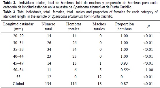 Las tablas 2 y 3 muestran la proporción de hembras, global y específica por tamaño, y la probabilidad binomial p, el nivel de significancia más pequeño en el que la hipótesis nula de una razón de sexos 1:1 podría ser rechazada dada la proporción observada de hembras, ya comentado en la metodología. Aquellas proporciones que no permiten rechazar tal hipótesis para un nivel de significancia de 0.01 se indican con asteriscos. Las clases de tamaños correspondientes a dichas proporciones pueden considerarse entonces como las clases críticas para el cambio de sexo. Destaquemos de dichas tablas los aspectos siguientes: