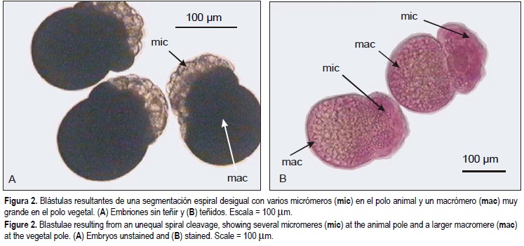 Días 3-7: Segmentación. Segmentación espiral con un macrómero vegetativo lleno de vitelo y más de 20 micrómeros de tamaño variable con núcleos evidentes en el polo animal, los mayores adyacentes al macrómero y los más pequeños distales (fig. 2a, b). Largo: 198 µm (DE ± 88.5, rango: 166-282 µm). Ancho: 172 µm (DE ± 58.6, rango: 128-343 µm).