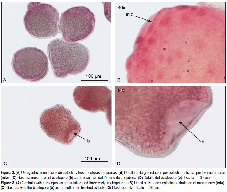 Días 8-12: Gastrulación. En embriones con gastrulación inicial, los micrómeros periféricos se aplanan para iniciar su desplazamiento mediante epibolia (fig. 3a, b). En aquellos donde ésta ha terminado, se observa el blastoporo (fig. 3c, d). Largo: 198 µm (DE ± 88.5, rango: 166-282 µm). Ancho: 172 µm (DE ± 58.6, rango: 128-343 µm). Posteriormente inicia la formación de los llamados riñones larvarios que, de acuerdo con Fretter and Graham (1994), son proyecciones del ectodermo de una o varias células en las que se acumulan productos de excreción durante la fase embrionaria. Se observa la presencia de cilios en el blastoporo, en las protuberancias laterales (riñones larvarios) y en el extremo opuesto al blastoporo. Largo: 187 µm (DE ± 57, rango: 147-408 µm). Ancho: 164 µm (DE ± 42.4, rango: 132-361 µm).