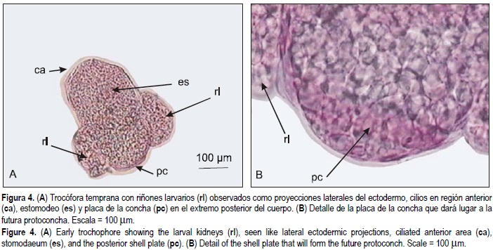 Acevedo-García et al. (1993) mencionaron en P pansa una larva trocófora típica similar a la de los bivalvos, cilíndrica, con forma característica de barril, sin embargo no se hace mención de la presencia de los riñones larvarios, lo que nos sugiere una diferencia morfológica. Con relación a la morfología de la larva trocófora, Roller y Stickle (1988) con ayuda del microscopio electrónico de barrido, observaron en T. haemastoma canaliculata una larva distinta a la típica. En este trabajo, el resultado obtenido usando la técnica de tinción de carmín acético fue muy similar al obtenido en T. haemastoma canaliculata por Roller y Stickle (1988), al descrito en C. concholepas por Gallardo (1973), y en T. chocolata por Bautista et al. (1995).