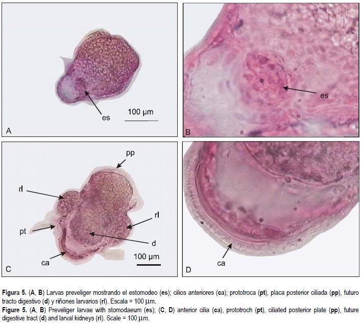 Días 17-18: Larva preveliger. Una capa de células aplanadas recorre toda la periferia de la larva y dará origen el ectodermo. Su región anterior es ciliada hasta el inicio de los riñones larvales. Se observa un espacio entre este epitelio ciliado y la zona ligeramente anterior al estomodeo, en el cual se llevará a cabo la formación del velum de la larva veliger, y el epitelio ciliado constituirá el inicio de sus lóbulos (fig. 5a, c, d). Los riñones larvarios son más protuberantes y más alargados, alcanzando casi el extremo posterior de la larva. El estomodeo de la larva preveliger está delimitado por células que van de aplanadas a cúbicas ciliadas (fig. 5b). De la boca hacia la región posterior de la larva se esboza la presencia de una estructura tubular-sacular que termina hacia el vitelo y que corresponderá al futuro tracto digestivo (fig. 5c). El vitelo relacionado con el futuro aparato digestivo es muy diferente a las plaquetas que contenía el macrómero, y presenta un aspecto granular muy fino. Se observaron estatocistos en algunas larvas preveliger. Largo: 262 µm (DE ± 23.7, rango: 222-334 µm). Ancho: 187 µm (DE ± 34.4, rango: 132-238 µm).