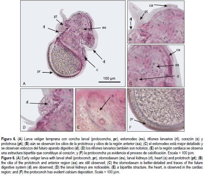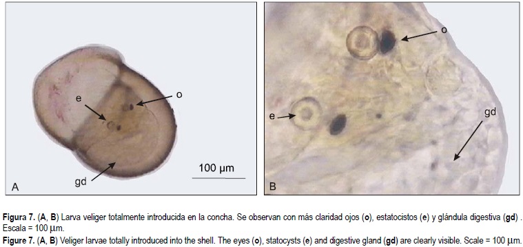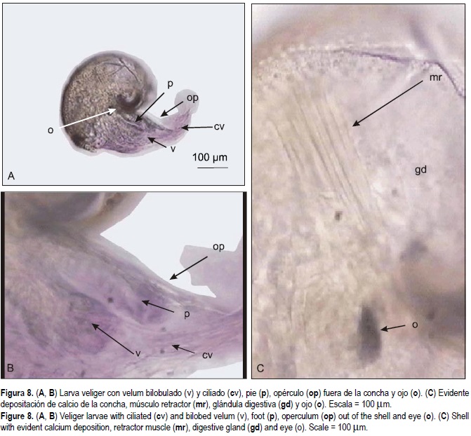 Días 19-24: Larva veliger. Las larvas se presentan parcial y totalmente introducidas en la concha, mostrando ésta varias etapas de desarrollo, sin y con espira (protoconcha); las más tempranas muestran el extremo anterior ciliado con un aspecto muy similar al del estadio anterior. También se presentan cilios de la prototroca (fig. 6b), los riñones larvarios son aún notorios (fig. 6a, d), y la región cardiaca aparece como una estructura bipartita (fig. 6e). La calcificación de la protoconcha ya es evidente (fig. 6f). Otras larvas muestran una membrana externa muy teñida (periostraco). Ojos y estatocistos están presentes (fig. 7a, b). Los estatocistos muestran una zona central de aspecto granulado y un epitelio externo con una ornamentación radial a manera de rayos de bicicleta. Algunas larvas presentan el proceso de torsión completo. El opérculo se observa como una zona alargada, muy delgada y refringente en el lado externo del pie. El pie está formado por células cúbicas ciliadas en su extremo distal (fig. 8a, b). Largo: 262 µm (DE ± 18.2, rango: 249-271 µm). Ancho: 194 µm (DE ± 36.3, rango: 141-217 µm).