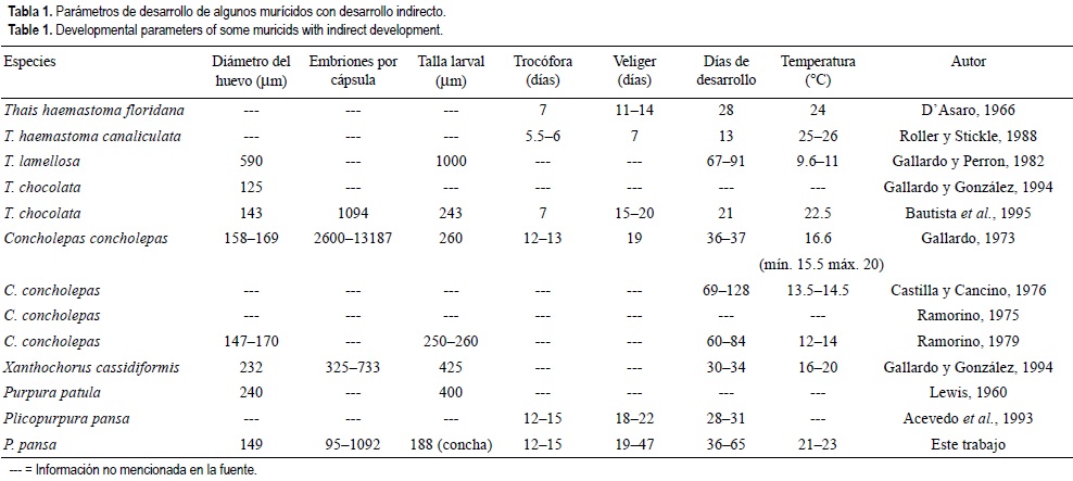 En cuanto a la talla de huevos y larvas así como al número de éstos contenido por cápsula, se puede considerar que en este estudio el promedio coincide el registrado para otros murícidos (tabla 1). Todos los huevos observados de P. pansa estaban fecundados y no se encontraron huevos nutricios, lo que indica un desarrollo dependiente de los recursos vitelinos al igual que lo observado en el murícido C. concholepas (Gallardo, 1973).
