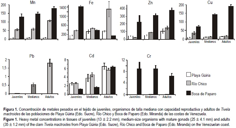 En la figura 1 se muestran las concentraciones de metales pesados (ng de metal en g de tejido) registradas en las tres poblaciones para las diferentes tallas (juveniles, medianos y adultos) de T. mactroides. La acumulación de los metales analizados presentó el orden siguiente: hierro > zinc > manganeso > cobre > cromo > cadmio > plomo.