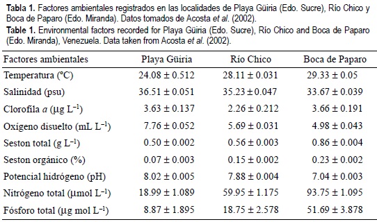 Las diferencias obtenidas con respecto a los factores ambientales muestran la calidad ambiental de cada zona, la cual ya había sido reportada en un análisis previo por Acosta et al. (2002). De esta manera, Playa Güiria presentó niveles dentro de los límites naturales para ecosistemas marinos, mientras que Río Chico y principalmente Boca de Paparo presentaron valores que indican perturbación ambiental debida a la influencia de las descargas provenientes del Río Tuy.