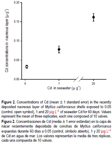 The method developed in this study to separate a section of the most recently deposited nacreous layer from the shell of M. californianus is fast and simple. This technique was applied to shells from organisms used in an experiment performed in our laboratory, where M. californianus were exposed for 60 days to three different dissolved Cd concentrations: 0.05 (control), 1 and 20 µg L-1. Analysis of the most recently deposited nacreous layers showed significant increases in their Cd concentrations (0.078 ± 0.016 and 0.162 ± 0.018 µg g-1, respectively) relative to the control (0.033 ± 0.006 µg g-1) (fig. 2). The proposed method represents a valuable tool for processing large number of valves and, more important, it can be applied even in shells that are not in good external and internal conditions due to the high-energy environment where M. californianus species is normally found.