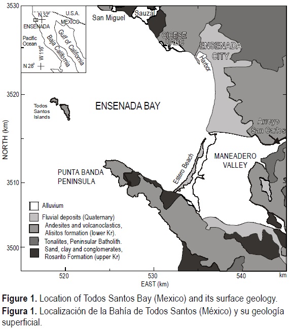 The Todos Santos Coastal Plain covers an area of 150 km2 occupied by the city of Ensenada, Maneadero Valley (Ejido Sánchez Taboada) and Todos Santos Bay. The area is a half-graben controlled by the Agua Blanca fault as the southern limit. This half-graben is filled with more than 2000 m of sediments of unknown age. The mesas to the north do not pass beneath these deposits but stand as high bluffs that were once wave-battered headlands (Gastil et al., 1975).