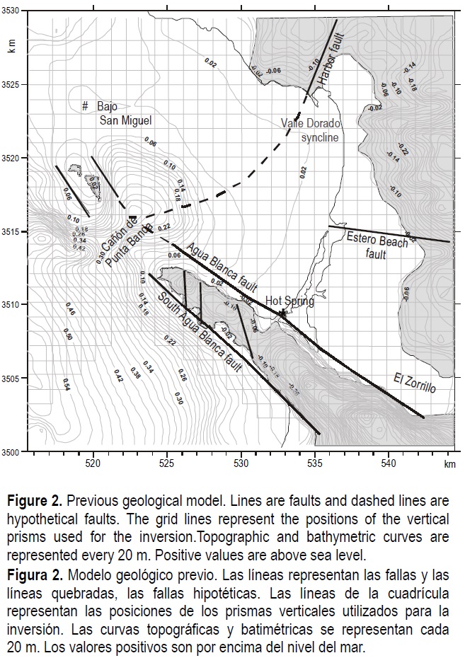 The magnetic data cover the onshore area from Punta Banda to Maneadero, Ensenada city and toward San Miguel (fig. 3c). The marine survey covers the bay very well, even outside the deep channel and the shallow waters of San Miguel in the NW of the bay. The bathymetry and marine magnetic data were taken by González-Fernández et al. (2000) with a dual frequency echosounder and magnetometer installed on the O/V Francisco de Ulloa owned by the Centro de Investigación Científica y de Educación Superior de Ensenada (CICESE). The land equipment consisted of two EG&G magnetometers. The data from González-Fernández et al. (2000) and Consejo de Recursos Naturales No Renovables (1962) were corrected by diurnal variation and IGRF value. Measurements were plotted together regardless of the differences in altitude, because the inversion process takes this into consideration. The gravity anomaly shows a high close to San Miguel and a low close to the Agua Blanca fault, indicating less dense material or deeper basement. The magnetic anomaly shows the lowest values at the middle of the bay, indicating less magnetic material or deeper magnetic basement.