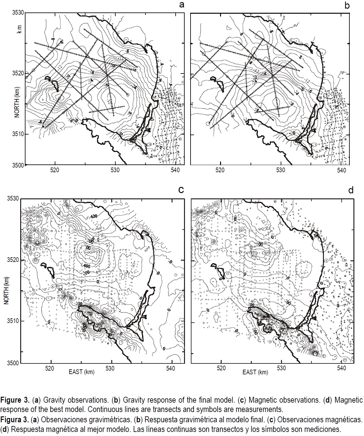 The algorithm allows variable altitude, so every gravity and magnetic measurement had (x, y, z) coordinates. The sea has a gravity response but not magnetic. Based on what is known about the bathymetry, we extracted the gravity response of the sea to the gravity anomaly in order to manage just the contrast between the sediments and the granitic-andesitic basement. The gravity and magnetic response of the best model resembles the measurements very well (fig. 3b, d).