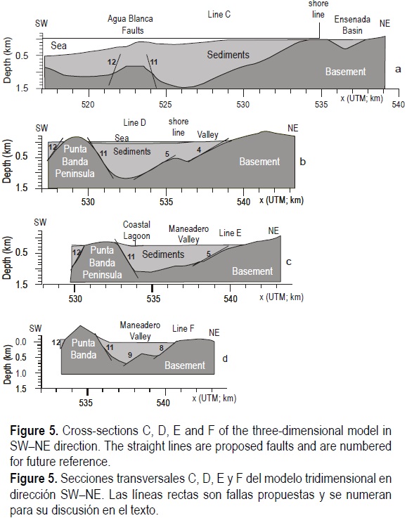 Line D (figs. 4, 5b) extends from Punta Banda to Valle Dorado. In the SW part, the Punta Banda peninsula (left side of the profile) is flanked by the Agua Blanca and Maximinos faults. In this profile, the deepest part of the bottom basin is at 1300 m and becomes shallower in the NE direction (right side of the profile). Despite the model being smoothed in the inversion, the data required two inflections before arriving at the hills around Valle Dorado. These small changes in the dip are interpreted as faults 5 and 4 (figs. 2, 7).