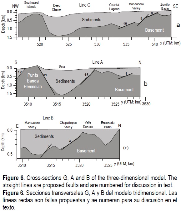 Line G runs (figs. 4, 6a) in NW-SE direction parallel to the Punta Banda peninsula, starting at Todos Santos islands and ending in El Zorrillo. In the NW part, the basement becomes shallower near the islands, then falls to the deepest part of the basin (1400 m) and turns complex between kilometers 527 and 533 UTM (fig. 7). This feature reflects the 3-D effects of the peninsula because the inversion was in 3-D. Between kilometers 535 and 540 UTM there are changes in the slope that may correspond to faults 10, 9 and 8 (fig. 7). At the end of the profile there is a small pond that corresponds to the El Zorrillo basin, 300 m in depth.