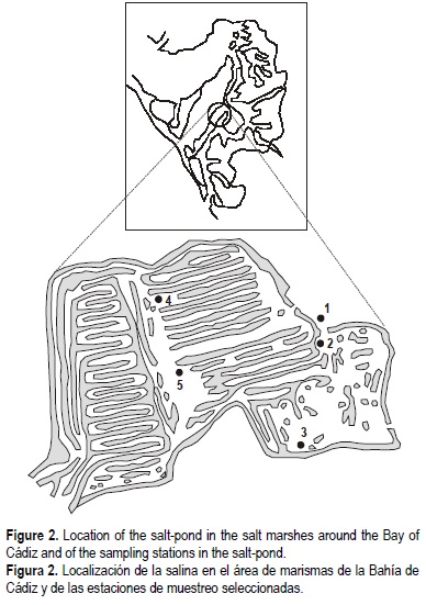 The salt-pond selected for this study is located in the southern part of the Sancti-Petri Channel, at a distance of 4 km from the Atlantic Ocean. It has a surface of 30 ha (fig. 1) and three floodgates to control the seawater exchange, allowing water to enter the salt-pond when the height of the tide exceeds 1.5 m. As a consequence of its location, the pond is not greatly affected by urban sewage, and the quality of the water as well as fish productivity are high (Blasco et al., 1987).