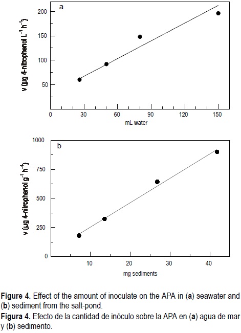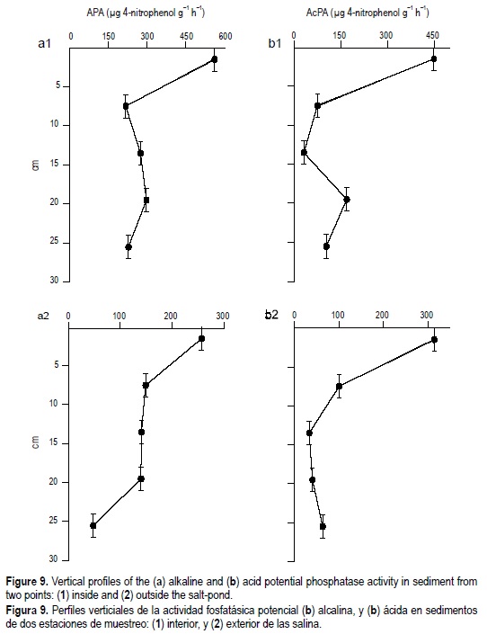 The methodology established allows the quantification of the phosphatase activity derived from the particulate matter of the seawater in the salt-pond. However, the total amount of phosphatase activity in seawater is the sum of the activity from the dissolved fractions and the particulate matter; the proportion varies depending on sample origin and season. In general, phosphatase activity from the particulate matter represents 75-90% of the total phosphatase activity (unpublished results). A similar range for enzymatic activity associated with particulate matter was reported by Huber and Kidby (1984a) for the Peel Harvey Estuary and by Berman (1970) for Lake Kinneret. Berman et al. (1990) found that a high proportion of phosphatase activities was assigned to the specific size fraction of the natural microplankton (<0.8 µm >0.2 µm). Although bacteria and algae are producers of alkaline phosphatase, their relative importance depends on the season and is related to algal blooms (Berman et al., 1990). In the photic zone, the phosphatases are mainly of phytoplanktonic origin. Consequently, there is a high correlation between APA and chlorophyll a in seawater and lakes (Solorzano, 1978; Smith and Kalff, 1981; Stewart and Wetzel, 1982; Siuda, 1984; Huber and Kidby, 1984b). Similarly significant correlations were reported earlier between clorophyll a and APA and AcPA in the ecosystem under study (Frutos, 1996).