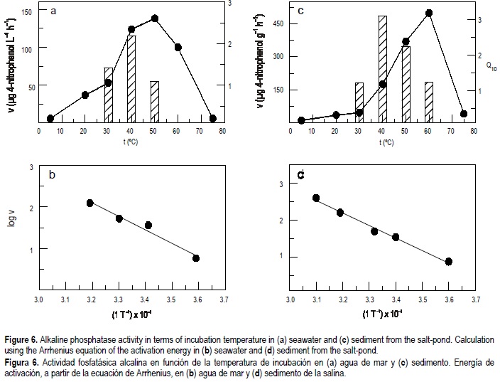 The mean value of Q10 for the sediments (fig. 6c) in the range of 30-60°C is 2.01, while for the water (fig. 6a) it is less (1.57). In seawater, the analysed range is 30-50°C, so when the temperature increases above this level, the activity decreases. These findings suggest that the enzymes involved in phosphatase activity in the sediment are more sensitive to temperature than the seawater enzymes. The values reported for these parameters in sediments were similar to the values found by Frankenberger and Tabatabai (1980) for other soil enzymes (aminohydrolases).