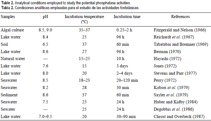 From a review of the bibliography, the analytical conditions for measuring potential enzymatic activities showed a wide variability depending on the location and sampling season (table 2). This can be due to differences between the species responsible for these activities (phytoplankton and bacterioplankton) and the season when the study was carried out.