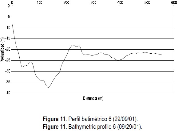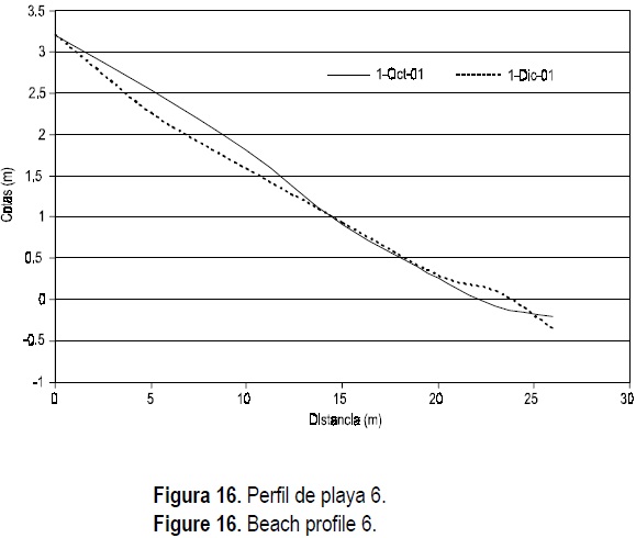 Las medidas de los perfiles de playa describen un patrón de erosión similar en todos ellos, por lo que sus datos del 1 de octubre y 1 de diciembre de 2001 (figs. 13, 14, 15, 16, 17) se graficaron, con excepción de los del perfil 6 (fig. 16) en el que se lleva a cabo depositación de sedimentos debido a su ubicación a un costado de la desembocadura del río y corriente abajo de la corriente litoral, siendo la primera sección que recibe el poco material sedimentario aportado por el río. Es posible observar la poca longitud de los perfiles de playa, contando el más largo con sólo 50 m de longitud (fig. 14). Esto se debe a que al final de cada perfil la pendiente cae abruptamente a más de 10 m en vertical. Obsérvese la figura 18 donde se compara el perfil batimétrico original y el perfil erosionado después del evento.