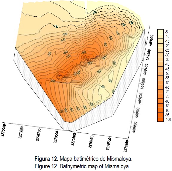 En la figura 12 se muestra el mapa batimétrico obtenido, notándose la presencia de un cañón submarino cuya profundidad alcanza casi 100 m. La orientación del cañón es hacia el SE coincidiendo su eje central precisamente con el frente del Hotel La Jolla de Mismaloya, donde se observan las mayores pendientes y donde el evento erosivo fue mayor.