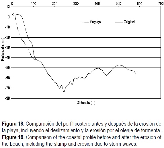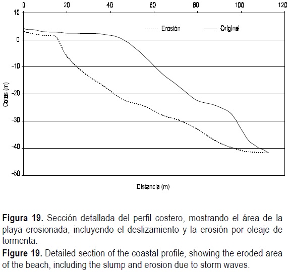 La figura 19 muestra la sección más detallada del perfil de playa y batimétrico, antes y después del evento erosivo, tomando como base el perfil batimétrico 4 (fig. 9) a una profundidad de cambio de pendiente de 41 m. Con base en este esquema se realizó un cálculo aproximado del volumen de material sedimentario erosionado durante el primer evento erosivo e integrándolo a toda la playa de Mismaloya, dando como resultado un total de 310, 332 m3.