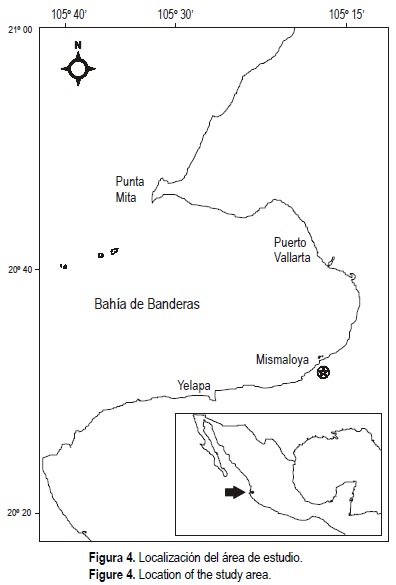 El área de estudio se conoce como Boca Mismaloya, se localiza a 20°32' latitud Norte y 105°15' longitud Oeste a 11.5 km al sur de Puerto Vallarta, Jalisco, México. El Río Mismaloya forma un pequeño delta limitado por dos puntas rocosas, a las faldas de altos acantilados que, combinados con la selva, sirven de marco para el asentamiento del desarrollo hotelero de gran turismo "La Jolla de Mismaloya", clasificado dentro de los 10 mejores lugares de esparcimiento en México (fig. 4).
