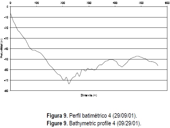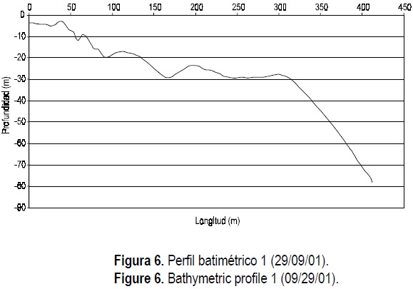 Con el objeto de conocer la morfología y evolución de la zona, se realizó una batimetría el 29 de septiembre de 2001. Se utilizó una ecosonda Bathy-500 obteniéndose seis perfiles batimétricos perpendiculares a la playa (fig. 5) y los datos fueron procesados con el programa Surfer 7.0.