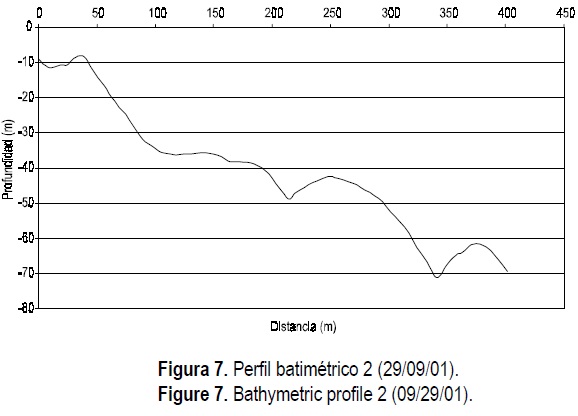 Para conocer las características fisiográficas de la pequeña bahía, se realizó una batimetría, recorriendo secciones a lo largo y ancho del área (fig. 5) y obteniendo así los perfiles y contornos batimétricos referidos al nivel de bajamar medio inferior.