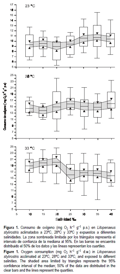 El consumo de oxígeno y la excreción nitrogenada se graficaron en cajas en paralelo (Tukey, 1977). Dentro de las cajas el 50% de los datos se distribuyó alrededor de la mediana y en los intervalos de confianza. El otro 50% se distribuyó en cada barra. Se utilizó un análisis de varianza de dos vías (Sigma Stat) para determinar el efecto de la temperatura y la salinidad sobre el consumo de oxígeno, la excreción nitrogenada y la osmolaridad de la hemolinfa de L. stylirostris. Para describir el efecto de la salinidad y la temperatura sobre la osmolaridad de la hemolinfa se utilizó una regresión lineal (Sigma-Stat). Los valores de los puntos isosmóticos (donde la osmolaridad de la hemolinfa es igual a la osmolaridad del medio) fueron determinados usando la fórmula de Ferraris et al. (1986). En los juveniles del camarón azul se calculó la capacidad osmorreguladora como la diferencia entre la osmolaridad de la hemolinfa y la del medio externo (Lignot et al., 2000).