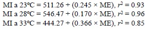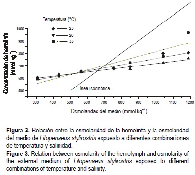 En los juveniles aclimatados a 23°C, 28°C y 33°C la osmolaridad de la hemolinfa se relacionó de manera lineal con respecto a la del medio externo, obteniéndose las siguientes ecuaciones: