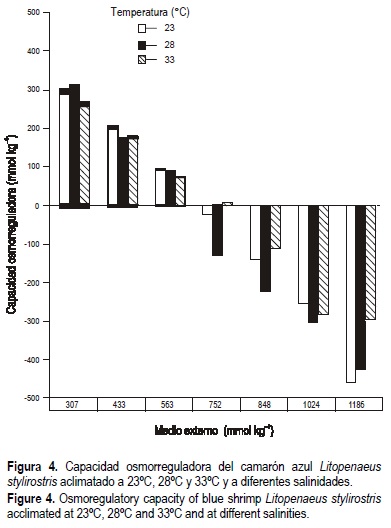 En los juveniles del camarón azul la capacidad osmorreguladora fue modificada significativamente por la salinidad (P < 0.05) de hiper a hiposmótica, ya que en las salinidades de 10-20% tuvo un intervalo de 306 a 10, en tanto que en las salinidades de 25-40% fue de -22 a -459 (fig. 4). La temperatura afectó de manera significativa (P < 0.05) la capacidad osmorreguladora de los organismos particularmente en los aclimatados a 33°C.
