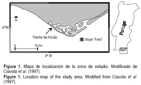 La zona de estudio se localiza en la playa de Faro, en el Algarve, al sur de Portugal. Dicha playa se ubica en la flecha de Ancão, la más occidental de las islas barreras y flechas litorales que forman el sistema de la Ría Formosa (fig. 1). Este sistema presenta una superficie de 170 km2 y, además de islas barreras y flechas, incluye una zona de marisma y una gran laguna costera que se comunica con el océano mediante seis canales de marea, encontrándose dos de éstos estabilizados por espigones.