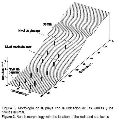 La morfología de la playa y la distribución de las varillas se presentan en las figuras 2 y 3. La playa seca y el intermareal se caracterizaron por una berma bien desarrollada, de gran continuidad lateral, sin que se registraran morfologías típicas de esta playa como canales de desagüe o cúspides (Balouin et al., 2001). La pendiente de la zona intermareal, claramente reflectiva (Wright y Short, 1984), se caracterizó por valores (tan β = 0.11) muy parecidos a los observados en una costa cercana por Ciavola et al. (1997) y Balouin et al. (2001).