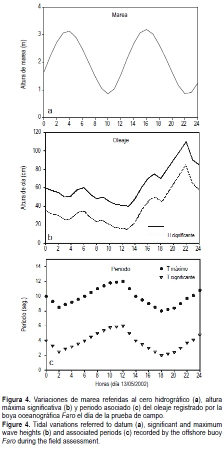 En la figura 4a, b, c se presentan, respectivamente, la curva de marea y los datos de altura de ola máxima y significativa y de periodo asociado, registrados el día del experimento en el campo. Dichos datos resultaron muy parecidos a los medidos en la playa durante la evaluación y reflejaron los cambios observados en el clima marítimo a lo largo del día.
