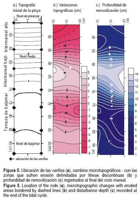 En la figura 5 se presentan los cambios microtopográficos y la profundidad de removilización observados durante la campaña. A pesar de la escasa altura de ola se registraron importantes cambios topográficos relacionados con el carácter erosivo del mar de viento y con la rompiente en voluta. Los valores máximos de erosión se registraron en la parte alta del intermareal (fig. 5b), debido a la mayor acción erosiva que ejerce el oleaje durante la pleamar, relacionada con el choque entre las olas incidentes y el reflujo (Williams, 1971) que tiene lugar durante mucho tiempo en la misma zona, en cuanto el nivel del mar queda en una posición estable. Los sedimentos erosionados se depositaron en la parte baja del intermareal evidenciando un transporte hacia el mar y un basculamiento del perfil alrededor del nivel medio del mar, típico de playas reflectivas (Nordstrom y Jackson, 1992). Finalmente, las varillas más bajas registraron cambios topográficos muy pequeños, típicos de playas disipativas, con rompientes en derrame.