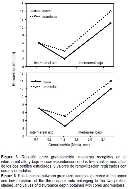 Finalmente, en cuanto a la comparación entre valores de profundidad de removilización obtenidos utilizando varillas y cores y arandelas, se observaron diferentes tendencias. Por un lado se registraron valores iguales donde prevalecia arena media, en el intermareal alto, mientras que las arandelas dieron valores mayores de removilización en el intermareal medio y bajo, constituido por arenas gruesas y gravas, siendo, sin embargo, las diferencias constantes y del orden de 2-3 cm, a pesar del aumento de la granulometria de la playa (fig. 6).